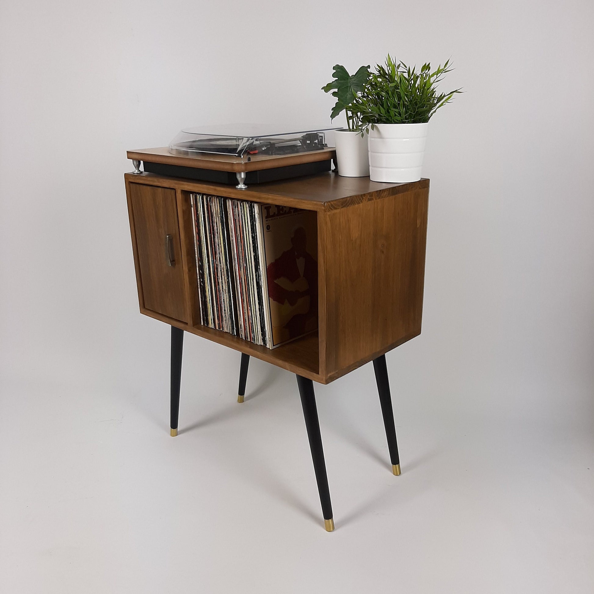 Our stylish, modern walnut side board/media table is designed to hold vinyl records but is also perfect as a living room sideboard, media console or even drinks cabinet. With clean lines it is inspired by mid century Danish minimalist furniture but with a unique modern twist. The legs are handmade dansette style legs made in Santiago, Spain. The handle is vintage brass.