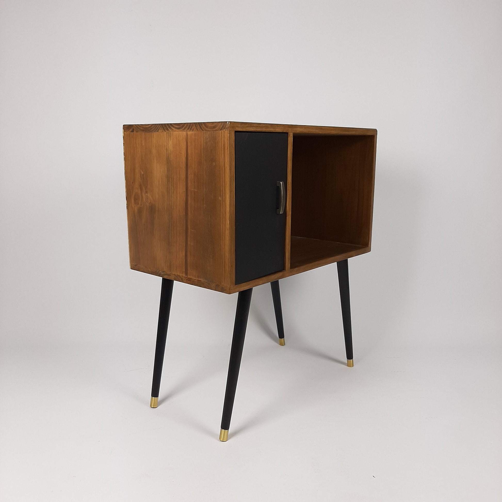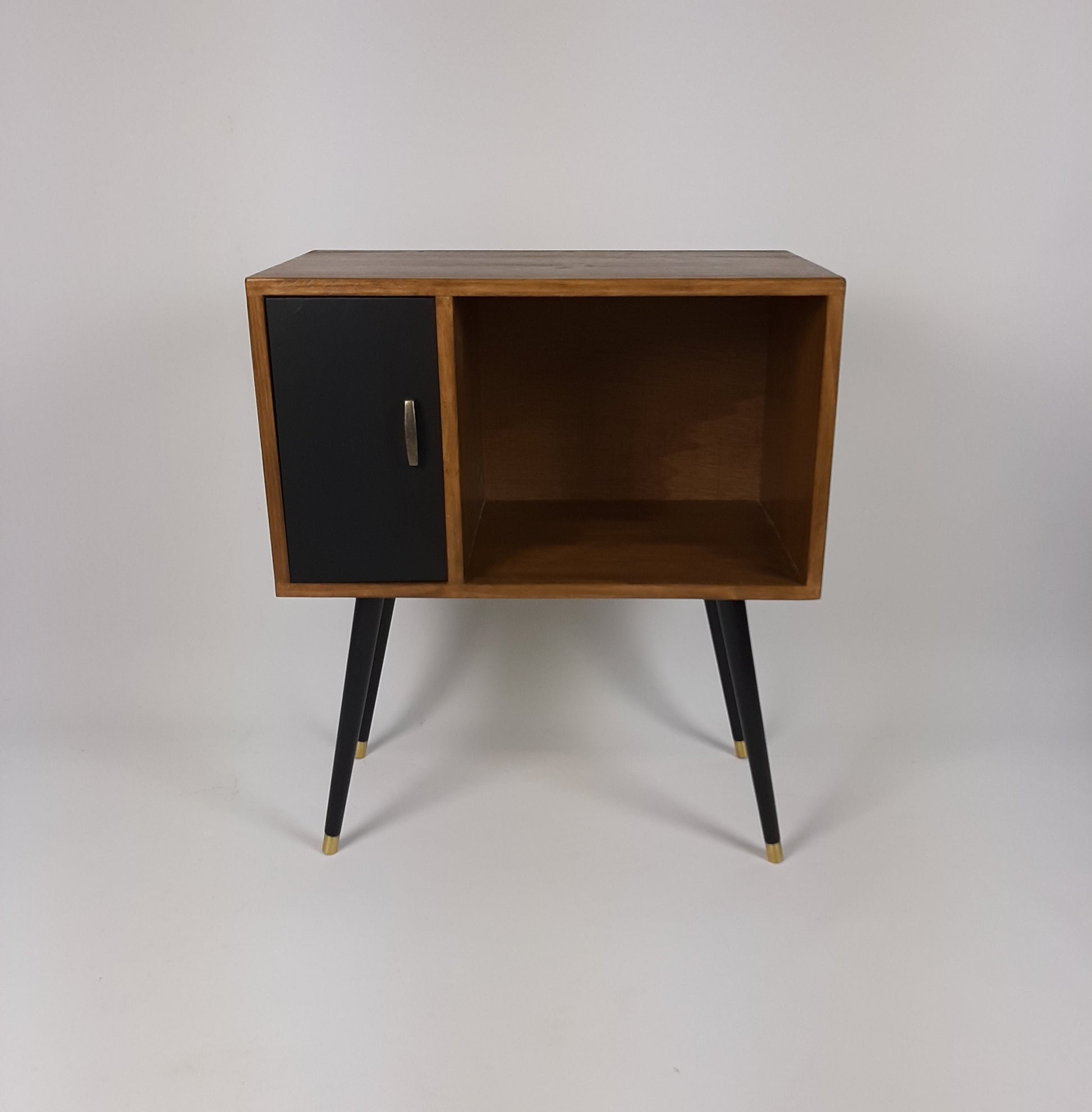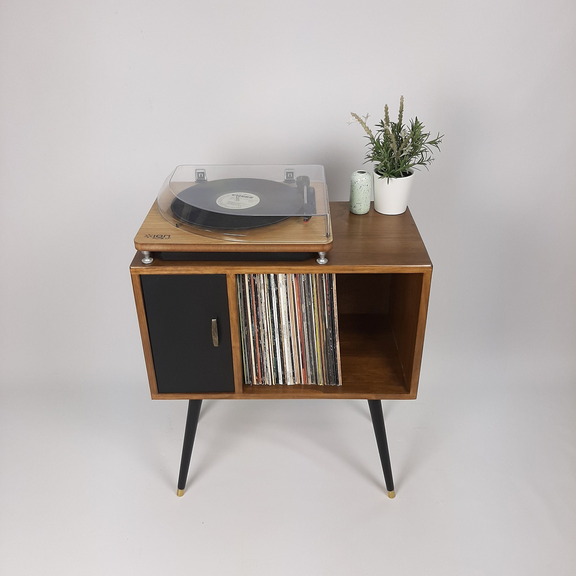 Our stylish, modern walnut side board/media table is designed to hold vinyl records but is also perfect as a living room sideboard, media console or even drinks cabinet. With clean lines it is inspired by mid century Danish minimalist furniture but with a unique modern twist. The legs are handmade dansette style legs made in Santiago, Spain. The matte black door is solid wood that has been painted, hand sanded and varnished.