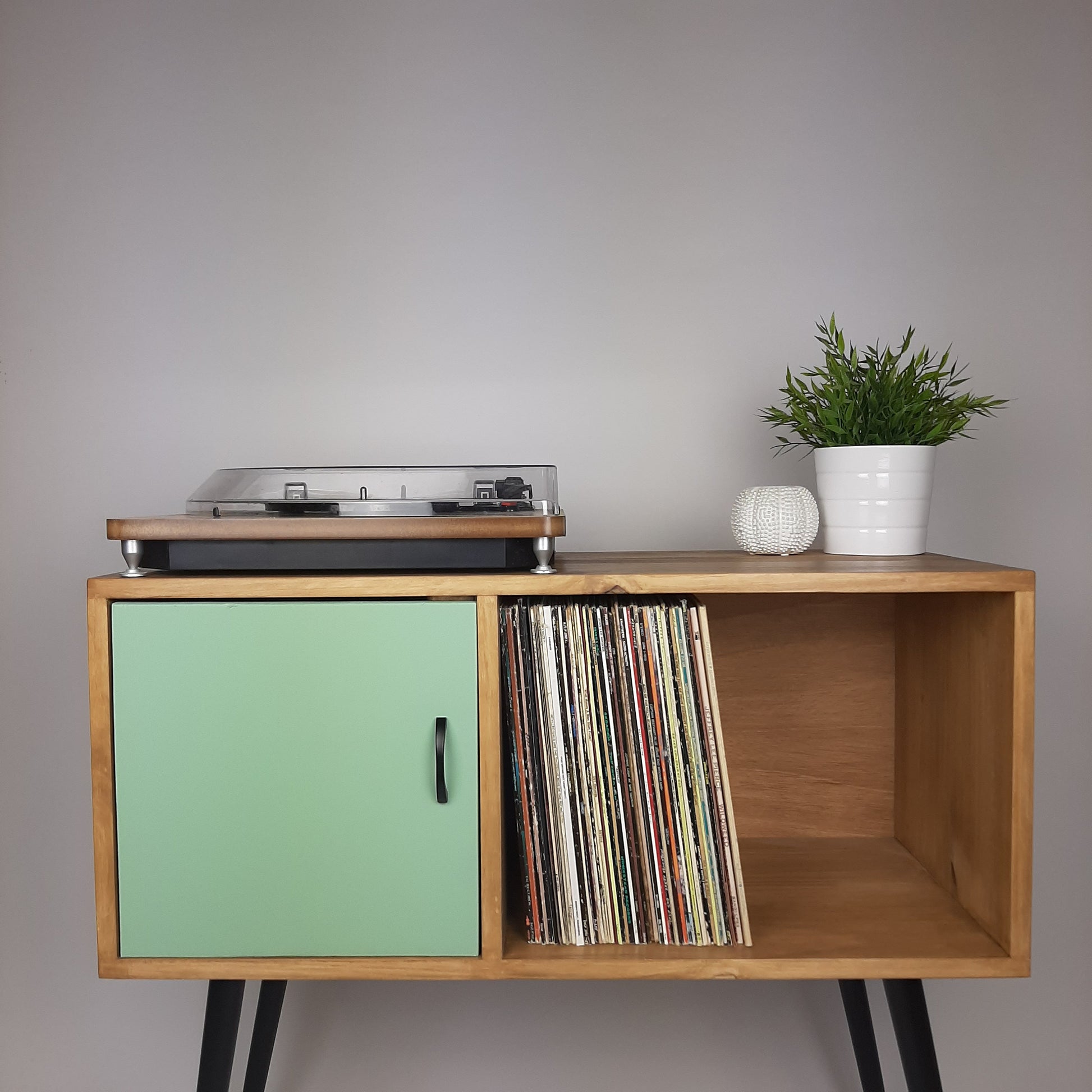 Oak Console Table with Pastel Green Door and Satin Black Handle | Vinyl Record Storage | Credenza | 100 % Sustainable