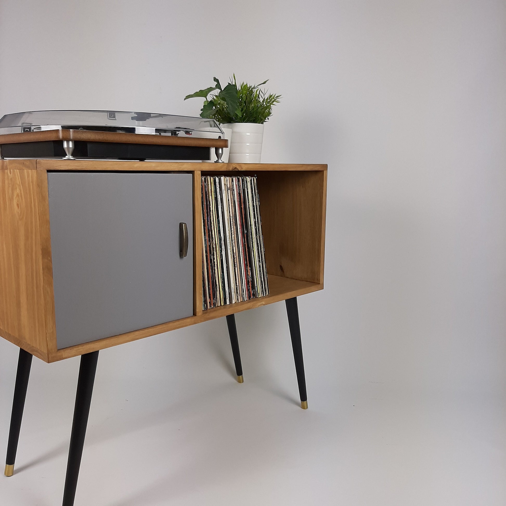 Our stylish, modern side board/media table is designed to hold vinyl records but is also perfect as a living room sideboard, media console or even drinks cabinet. With clean lines it is inspired by mid century Danish minimalist furniture but with a unique modern twist. The legs are dansette style solid wood and brass, handmade here in Santiago, Spain.