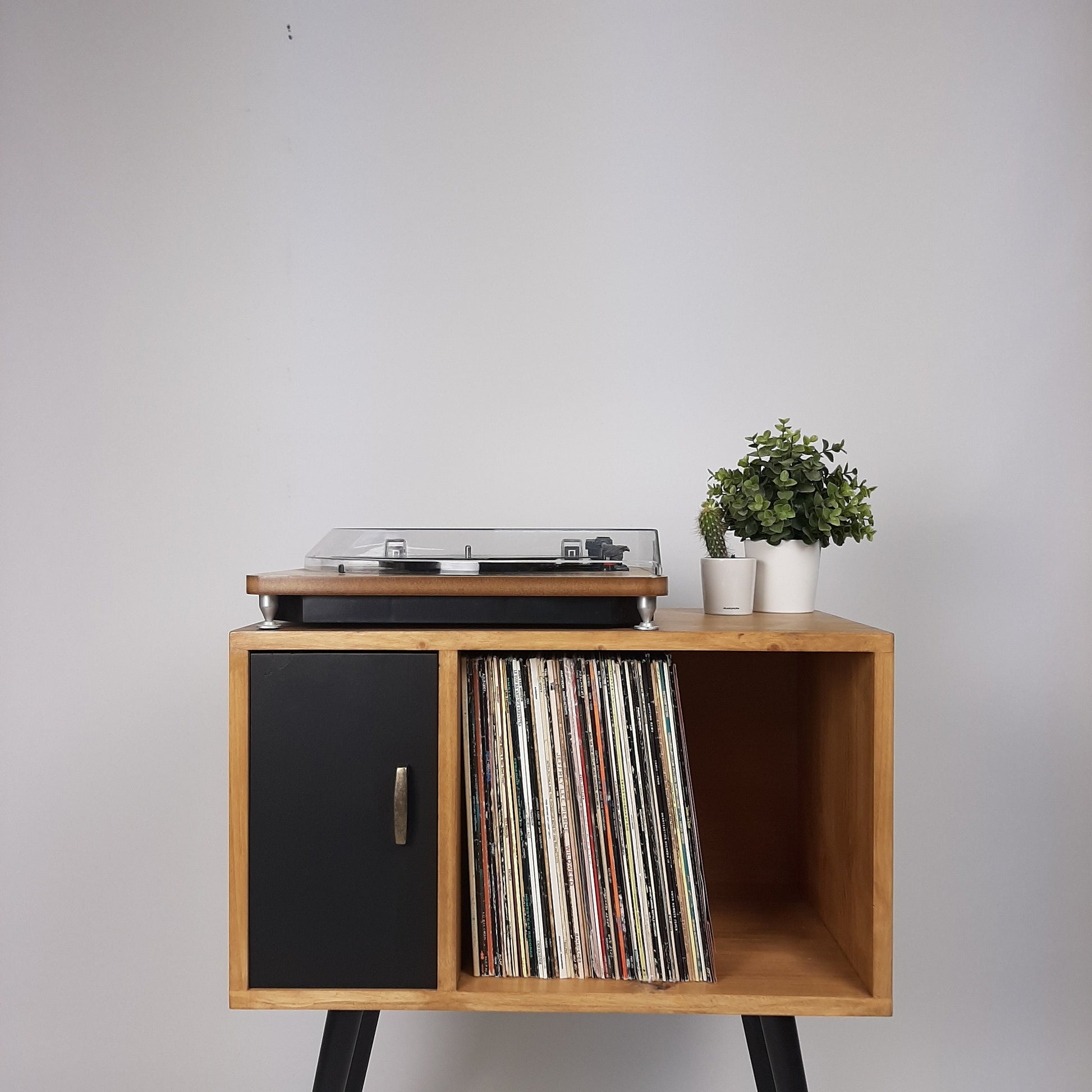 Our stylish, modern side board/media table is designed to hold vinyl records but is also perfect as a living room sideboard, media console or even drinks cabinet. With clean lines it is inspired by mid century Danish minimalist furniture but with a unique modern twist. The legs are handmade dansette style legs made in Santiago, Spain. The matte black door is solid wood that has been painted and varnished.