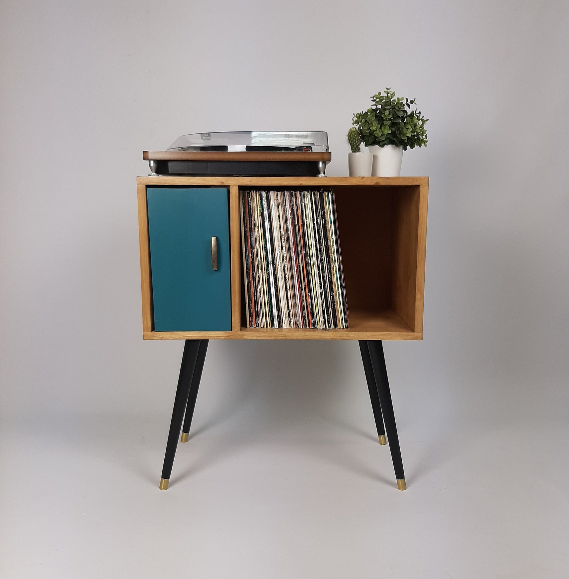 Our stylish, modern side board/media table is designed to hold vinyl records but is also perfect as a living room sideboard, media console or even drinks cabinet. With clean lines it is inspired by mid century Danish minimalist furniture but with a unique modern twist. The legs are handmade dansette style legs made in Santiago, Spain. The royal blue door is solid wood that has been painted and varnished.
