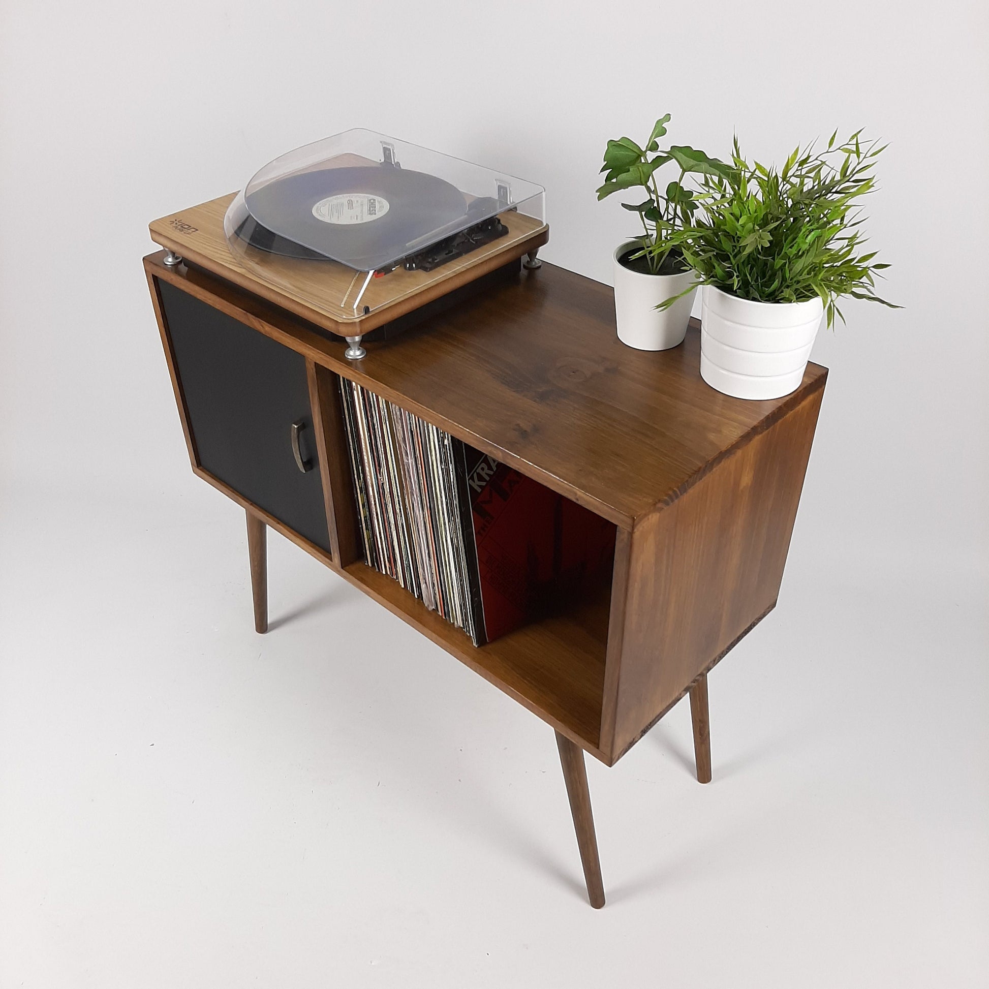 Record Table Walnut w/ Black Door and Wooden Legs | Medium Sideboard | Media Console | Vinyl Cabinet | Solid Wood Vinyl Record Table