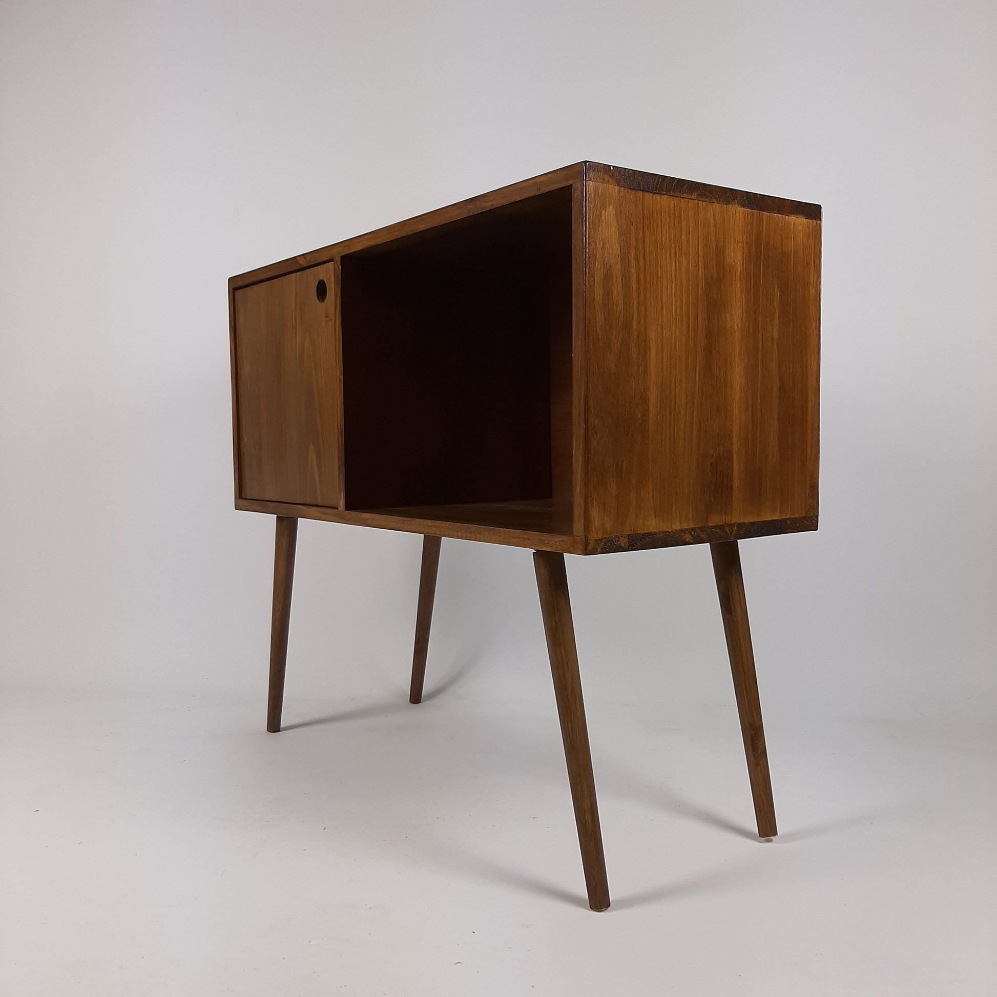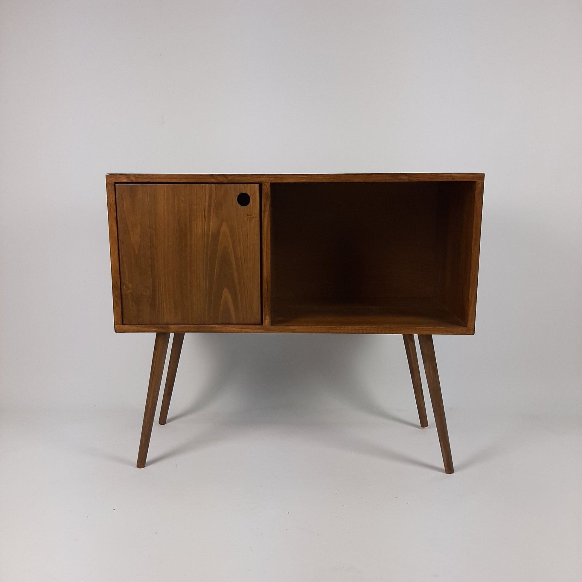 Our stylish, modern walnut side board/media table is designed to hold vinyl records but is also perfect as a living room sideboard, media console or even drinks cabinet. With clean lines it is inspired by mid century Danish minimalist furniture but with a unique modern twist. The beautiful, tapered wooden finished legs are handcrafted in our workshop in Santiago.