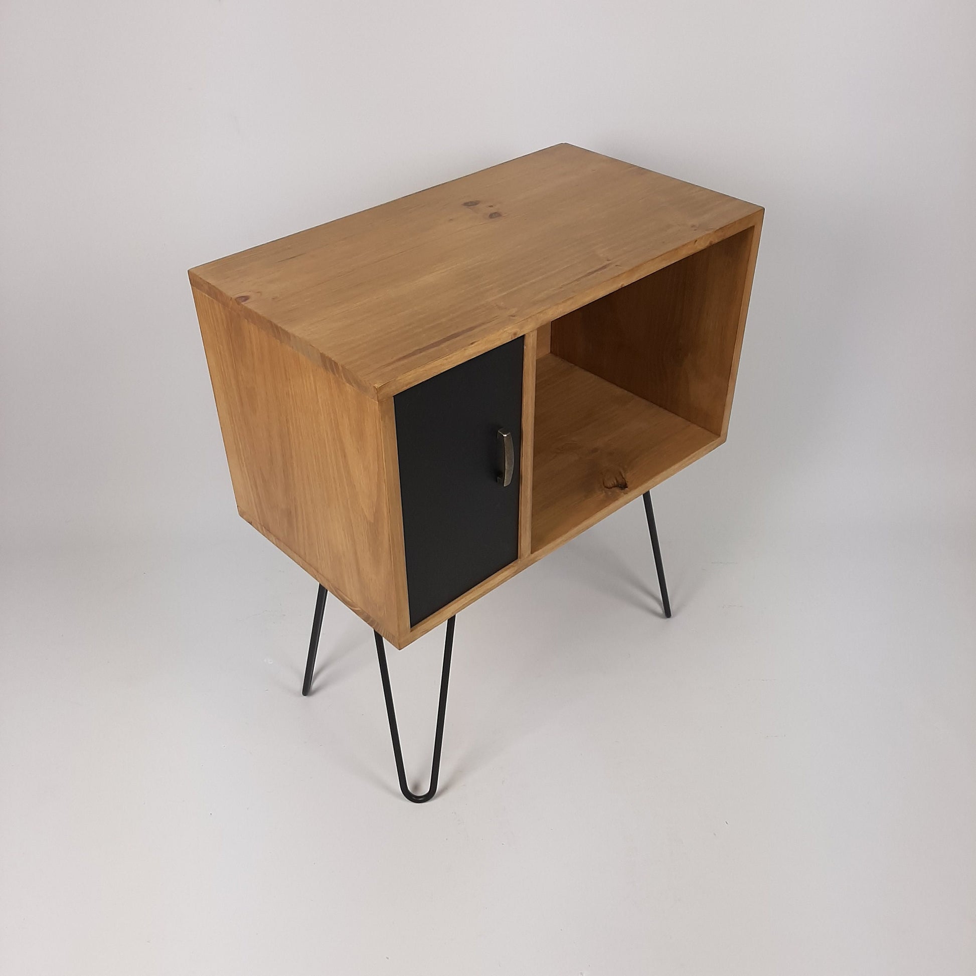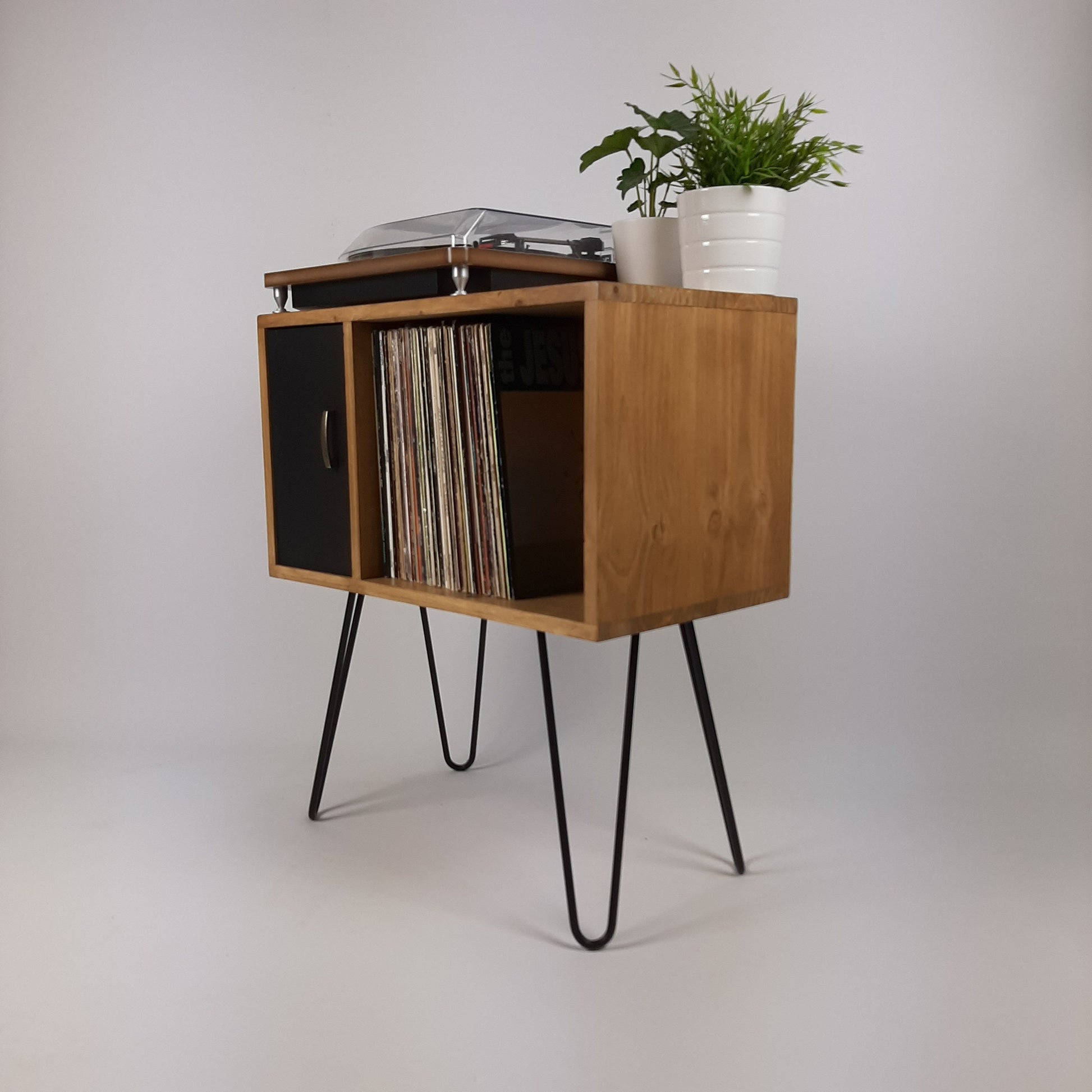 Our stylish, modern side board/media table is designed to hold vinyl records but is also perfect as a living room sideboard, media console or even drinks cabinet. With clean lines it is inspired by mid century Danish minimalist furniture but with a unique modern twist. The hairpin legs are brass coated solid steel made in the UK. The matte black door is hand-painted and varnished.