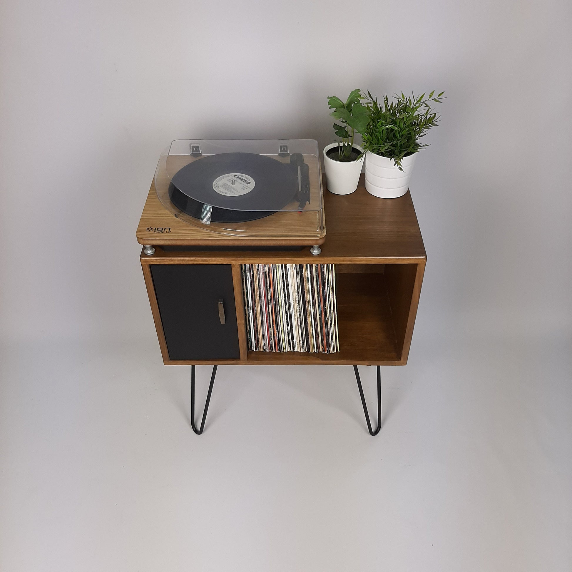 Small Walnut Sideboard | Black Door & Hairpin Legs | Record Deck Table | Vinyl Storage | Designer Sideboard | Minimalist Furniture