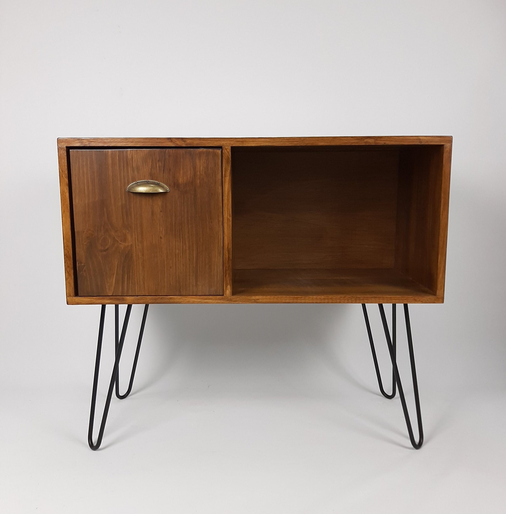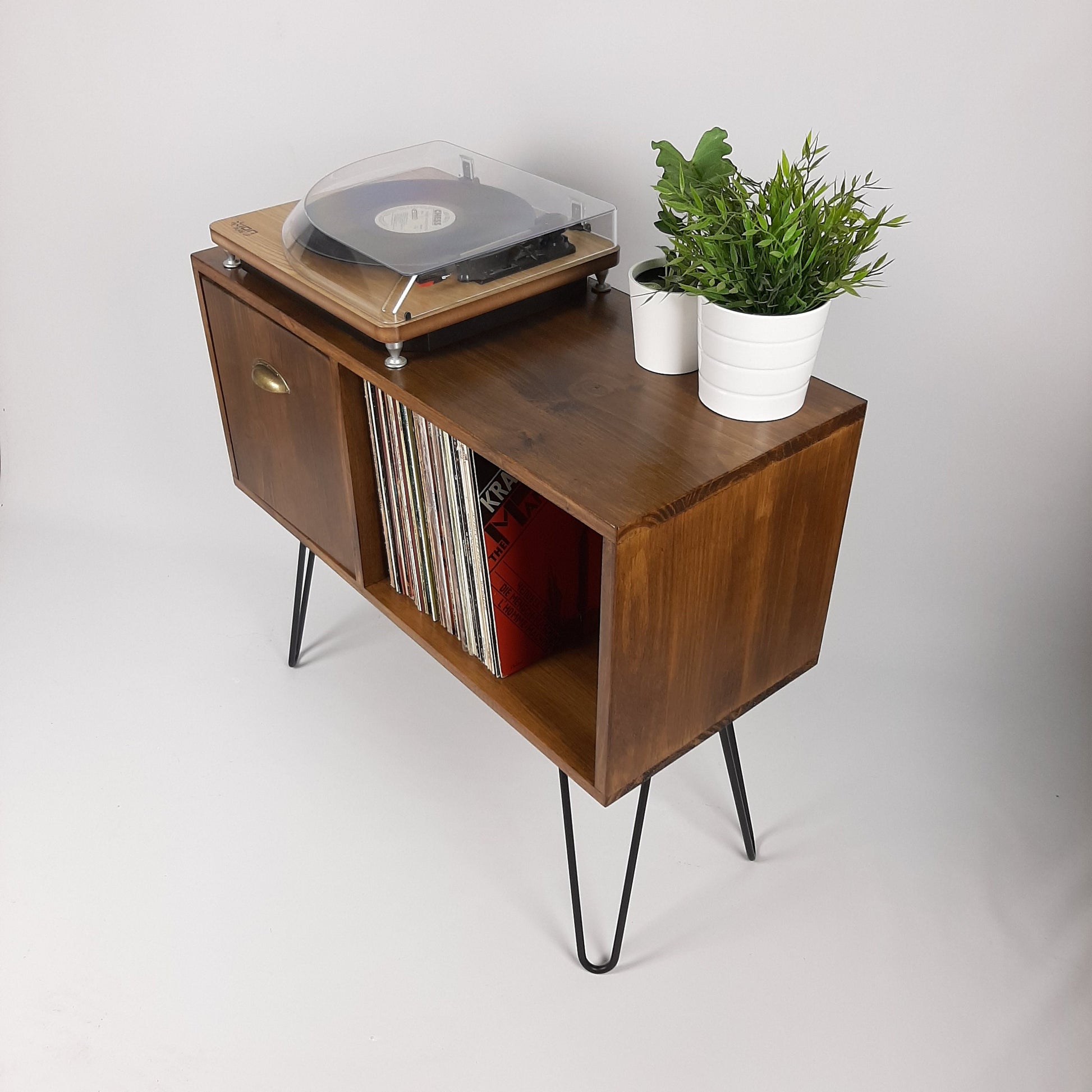 Our stylish, modern walnut side board/media table is designed to hold vinyl records but is also perfect as a living room sideboard, media console or even drinks cabinet. With clean lines it is inspired by mid century Danish minimalist furniture but with a unique modern twist. The hairpin legs are black laquered solid steel made in the UK.