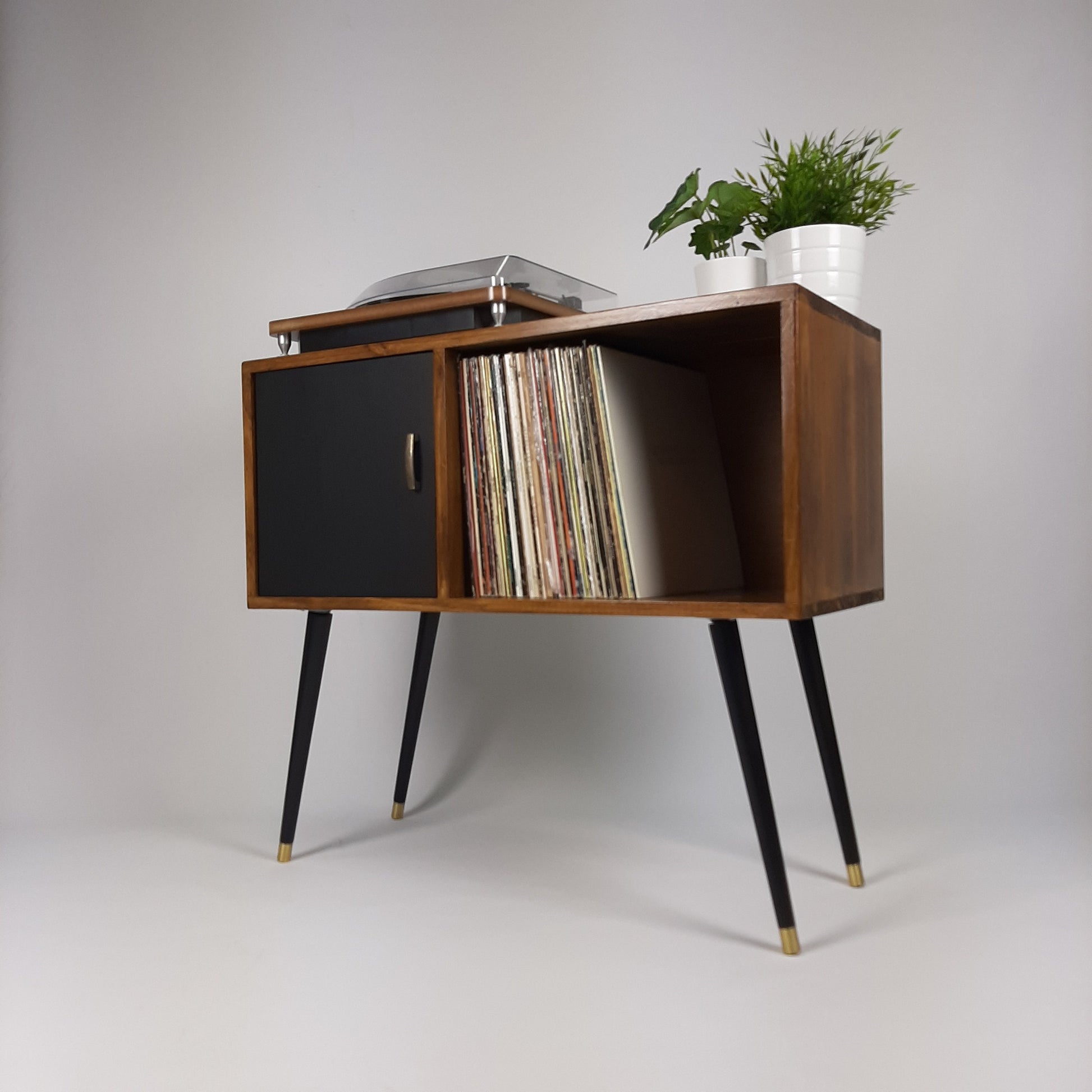 Our stylish, modern walnut side board/media table is designed to hold vinyl records but is also perfect as a living room sideboard, media console or even drinks cabinet. With clean lines it is inspired by mid century Danish minimalist furniture but with a unique modern twist. The legs are dansette style legs handmade here in Santiago de Compostela. The black door is solid wood that has been painted and varnished. The handle is vintage brass.