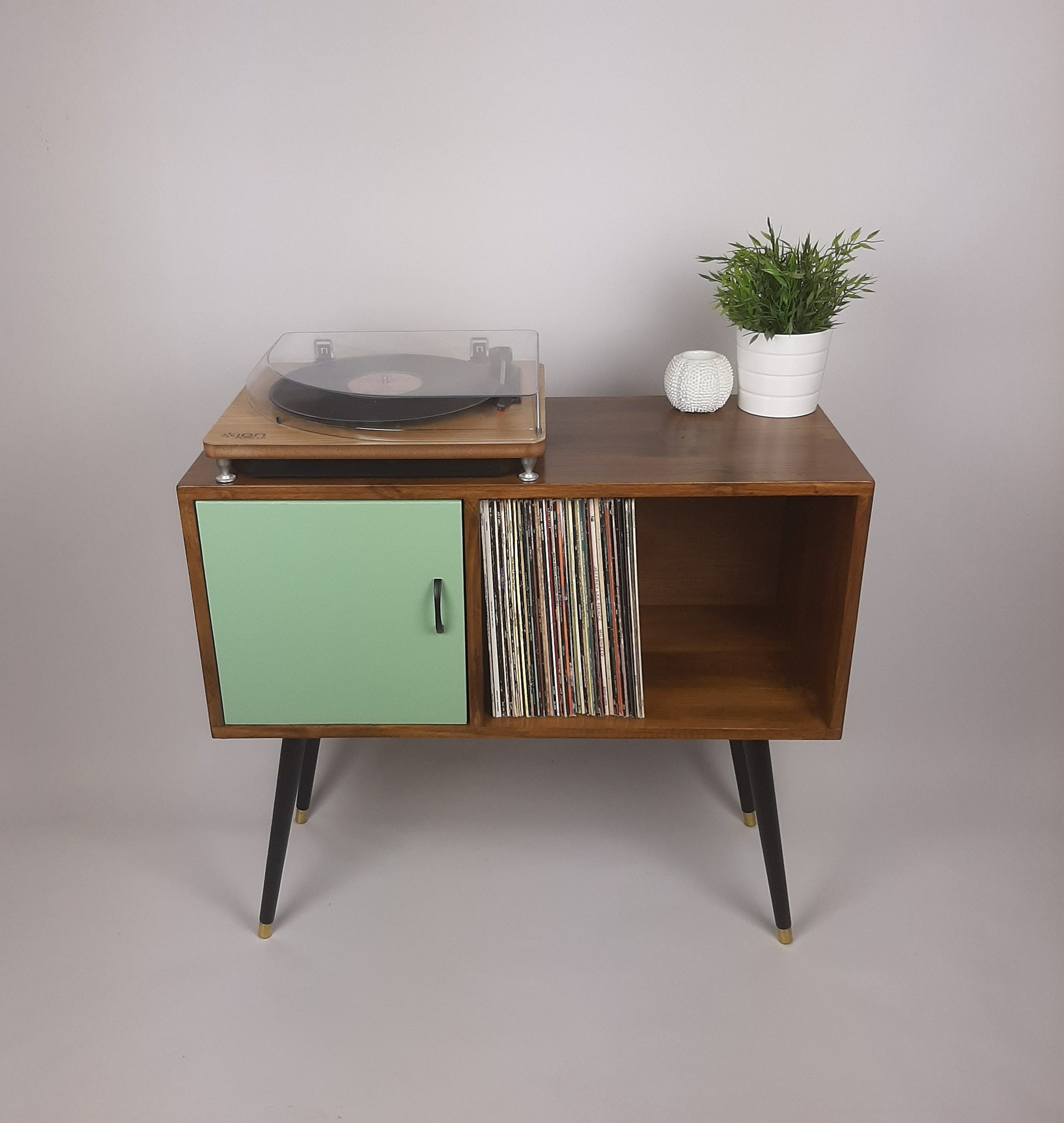 Our stylish, modern walnut side board/media table is designed to hold vinyl records but is also perfect as a living room sideboard, media console or even drinks cabinet. With clean lines it is inspired by mid century Danish minimalist furniture but with a unique modern twist. The legs are dansette legs handmade in Santiago de Compostella. The pastel green door is solid wood that has been painted and varnished.