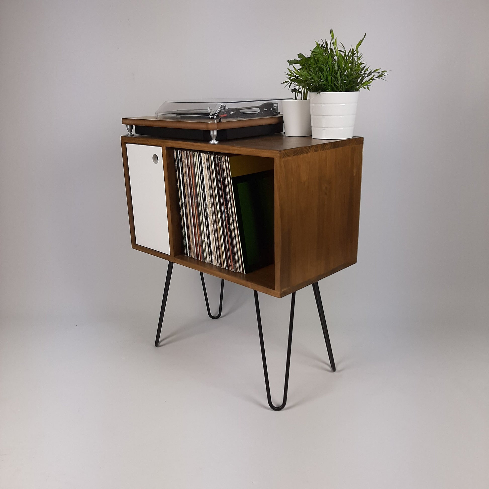 Our stylish, modern walnut side board/media table is designed to hold vinyl records but is also perfect as a living room sideboard, media console or even drinks cabinet. With clean lines it is inspired by mid century Danish minimalist furniture but with a unique modern twist. The hairpin legs are black laquered solid steel made in the UK. The white door is solid wood that has been painted and varnished.