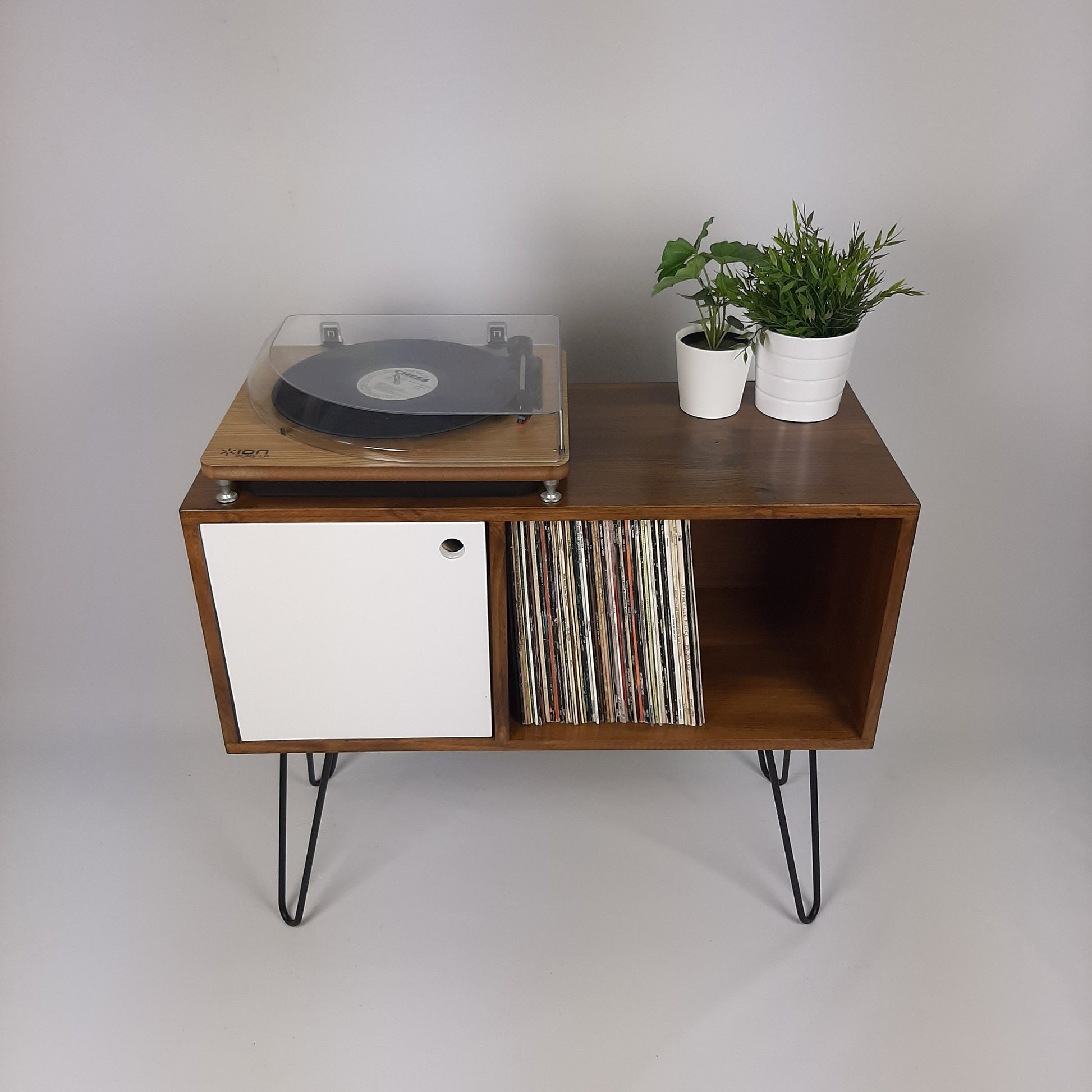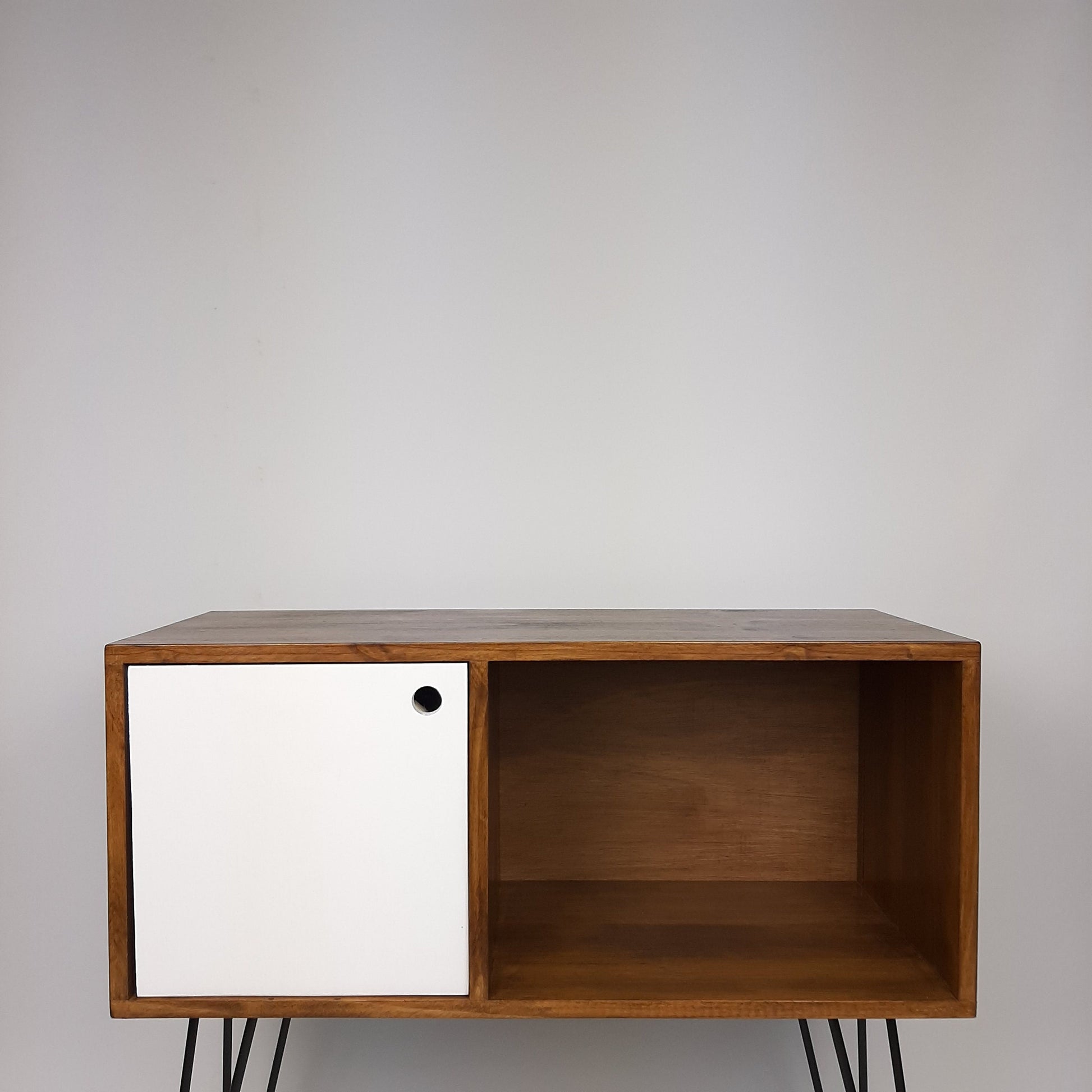 Walnut Sideboard w/ White Door & Black Hairpin Legs | Vinyl Record Storage | Media Console